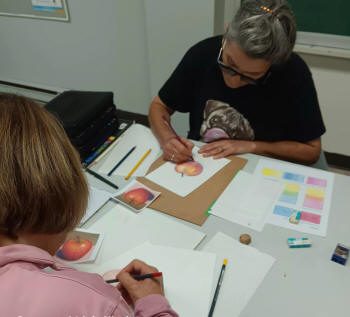 Lors de cet atelier créatif présenté par le trio artistique de Nicole Brûlé, Nicole St-Amant et Jocelyne O’Rourke, le 11 octobre 2025, les participant·e·s ont eu l’occasion d’explorer l’art du crayon de couleur à travers un sujet aussi simple que riche : la pomme.