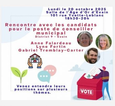 Venez échanger avec les candidat(e)s et découvrir leurs points de vue sur divers enjeux qui touchent notre quartier...